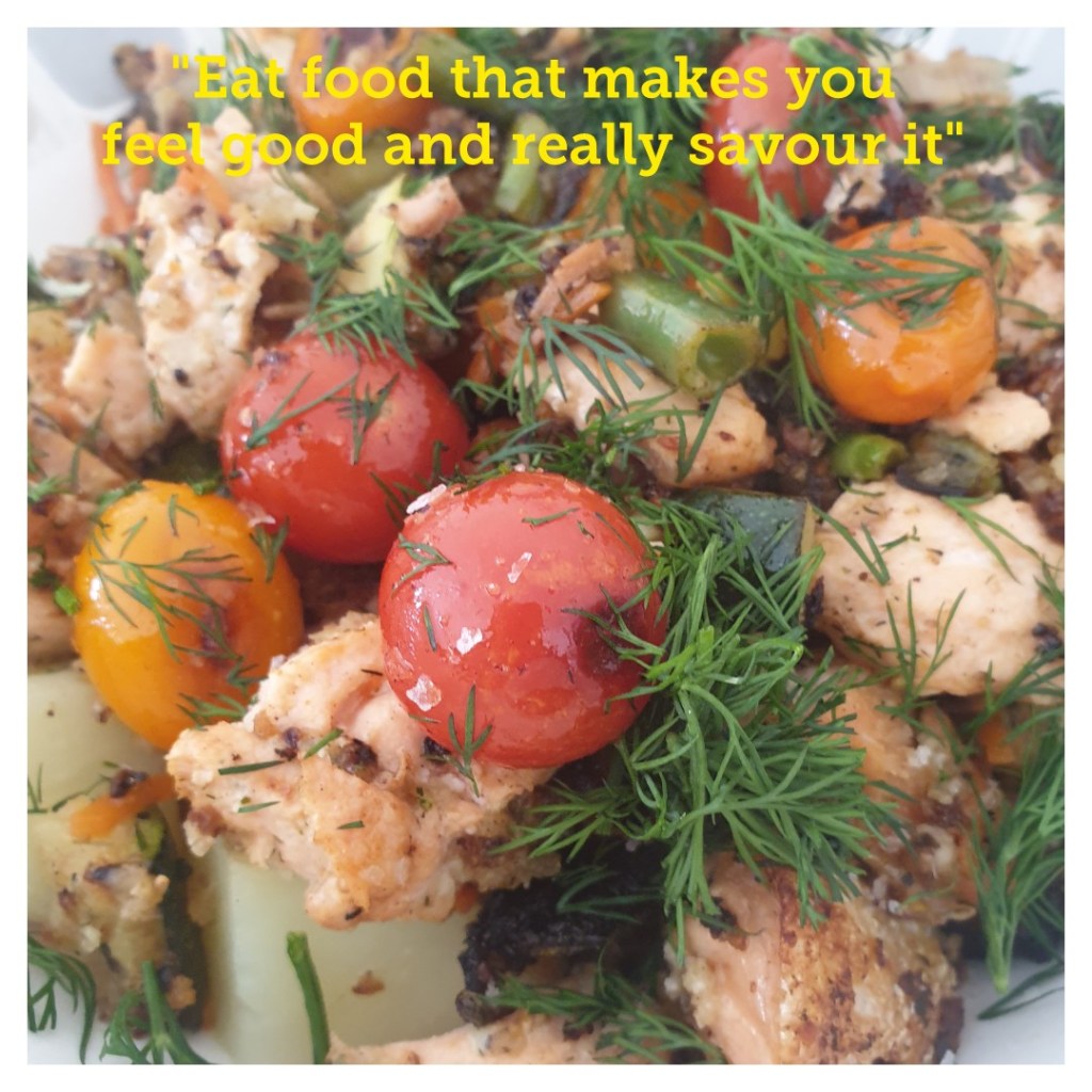 I’ve just made myself a lemon marinated smoked salmon potato salad with grilled tomatoes, green beans, leek, zuchinni, pickled carrot, broccoli & dill.