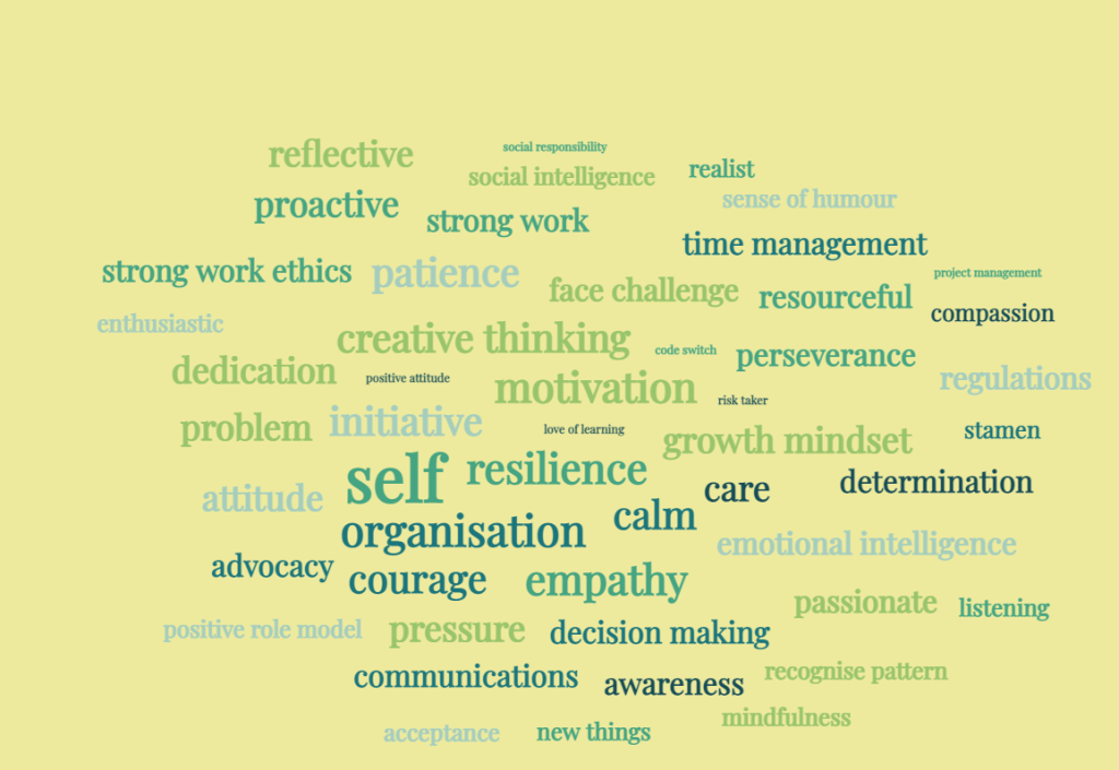 * Organisation, creative thinking, time management, positive attitude, sense of humour, empathy, adaptable, decision making, risk taker, willing to embrace change, code switch, resilience, social intelligence, calm under pressure, emotional intelligence, advocacy, recognise patterns, perspective, proactive, growth mindset, flexible . . . .