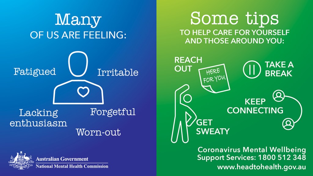The Australian National Mental Health Commission has some interesting social media resources and tip sheets which are downloadable from Pandemic Fatigue – National Mental Health Commission about this topic.
