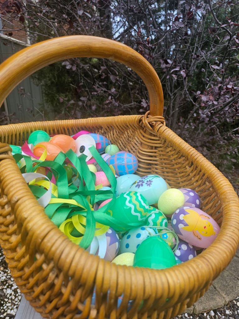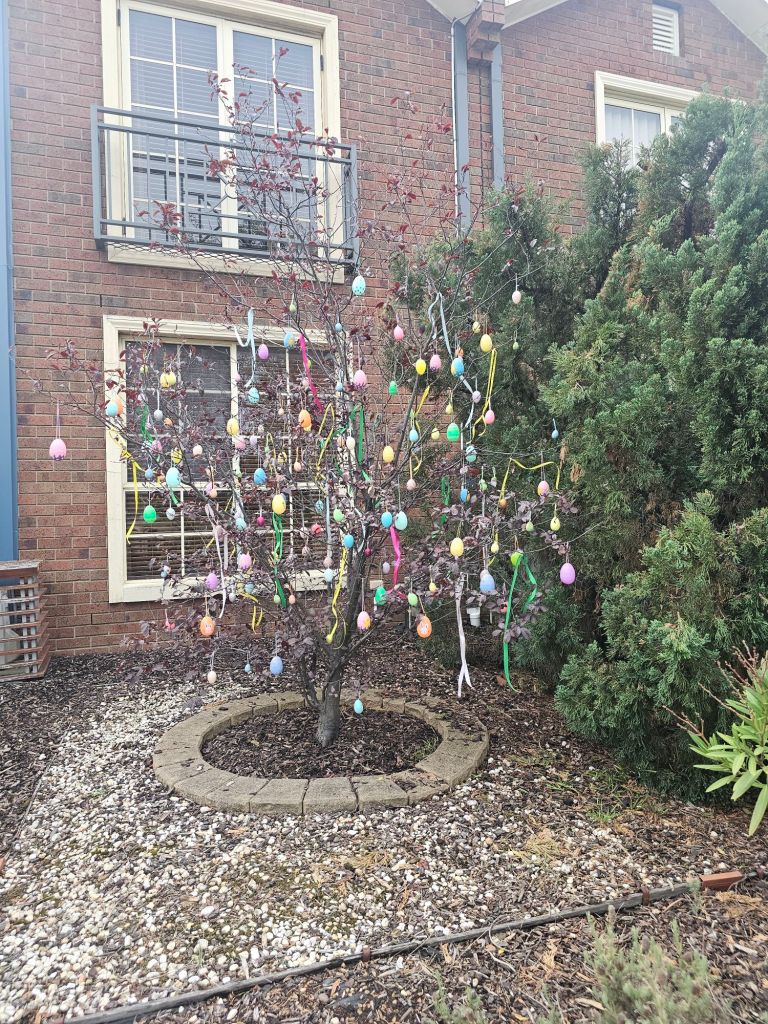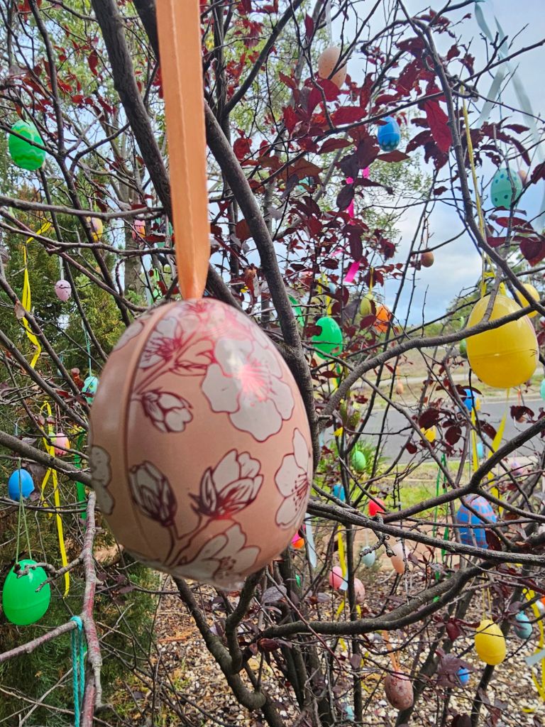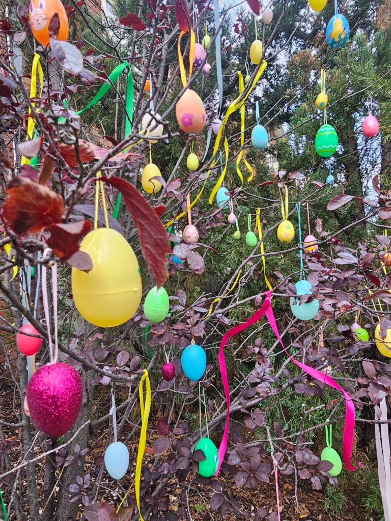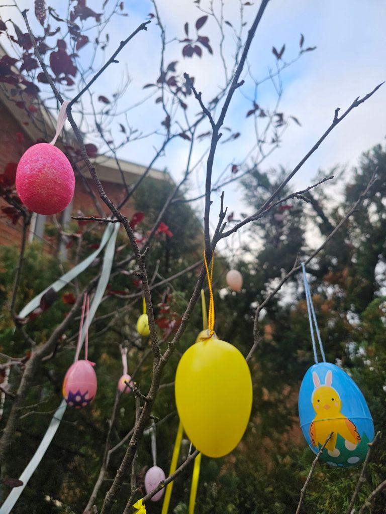 One by one, I hung the eggs – bright colours against a grey sky, ribbons catching what little breeze remained. A small ritual, inspired by the German Ostereierbaum tradition, bringing a little bit of spring into the garden.